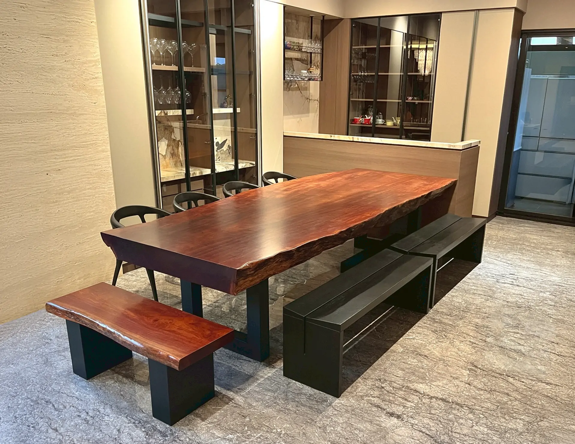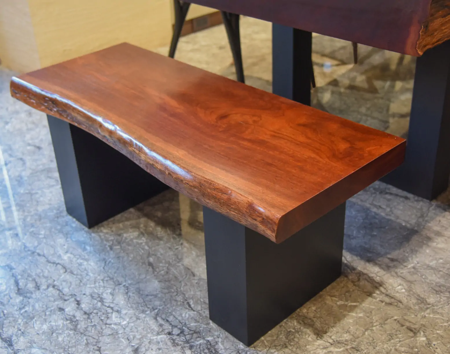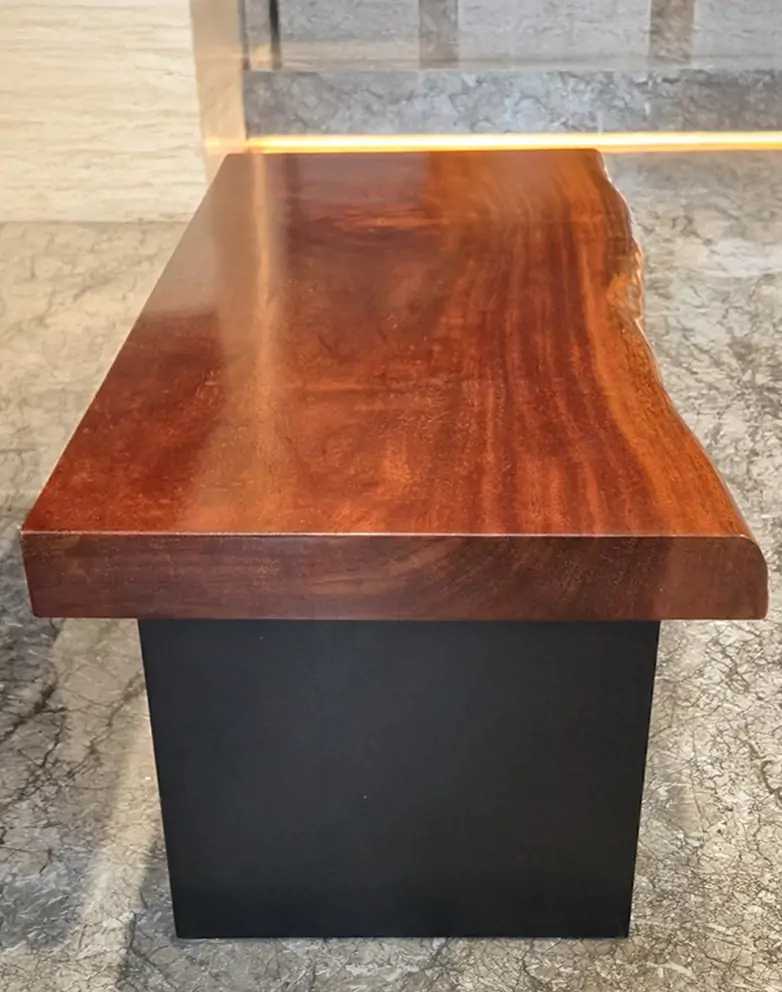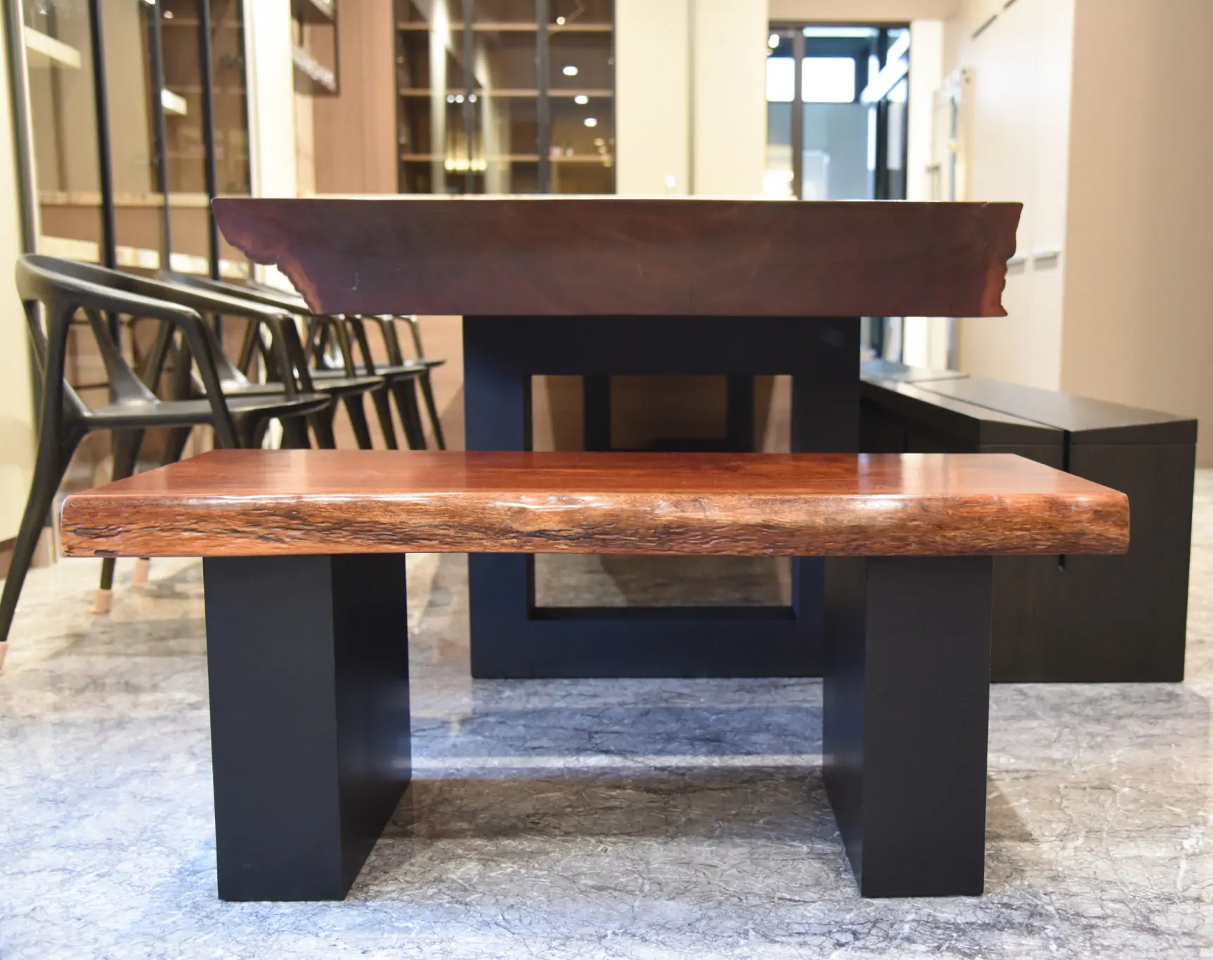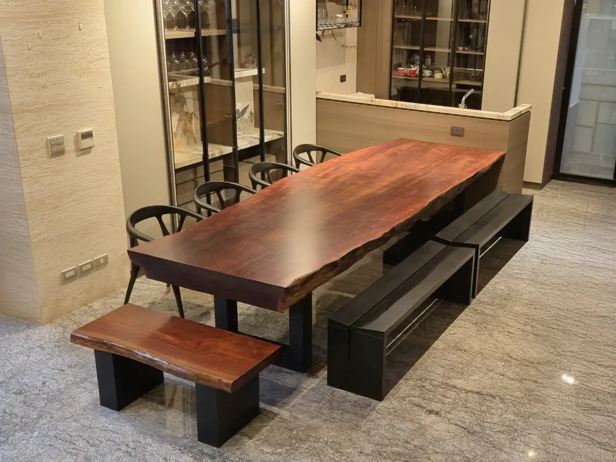 【🪵.#原木桌】 尺寸|360cm x 105cm x 15cm 面高|76cm 木種|非洲黑檀 硬度|高 桌腳|雙口字型鐵管腳 ——— 【🪵.#短板凳】 尺寸|105cm x 48cm x 6cm 面高|45cm 木種|非洲花梨 硬度|高 桌腳|實木腳 ——— 【🪵.#長板凳】 (客人自購) ——— 【🪵.#原木椅】 (客人自購)