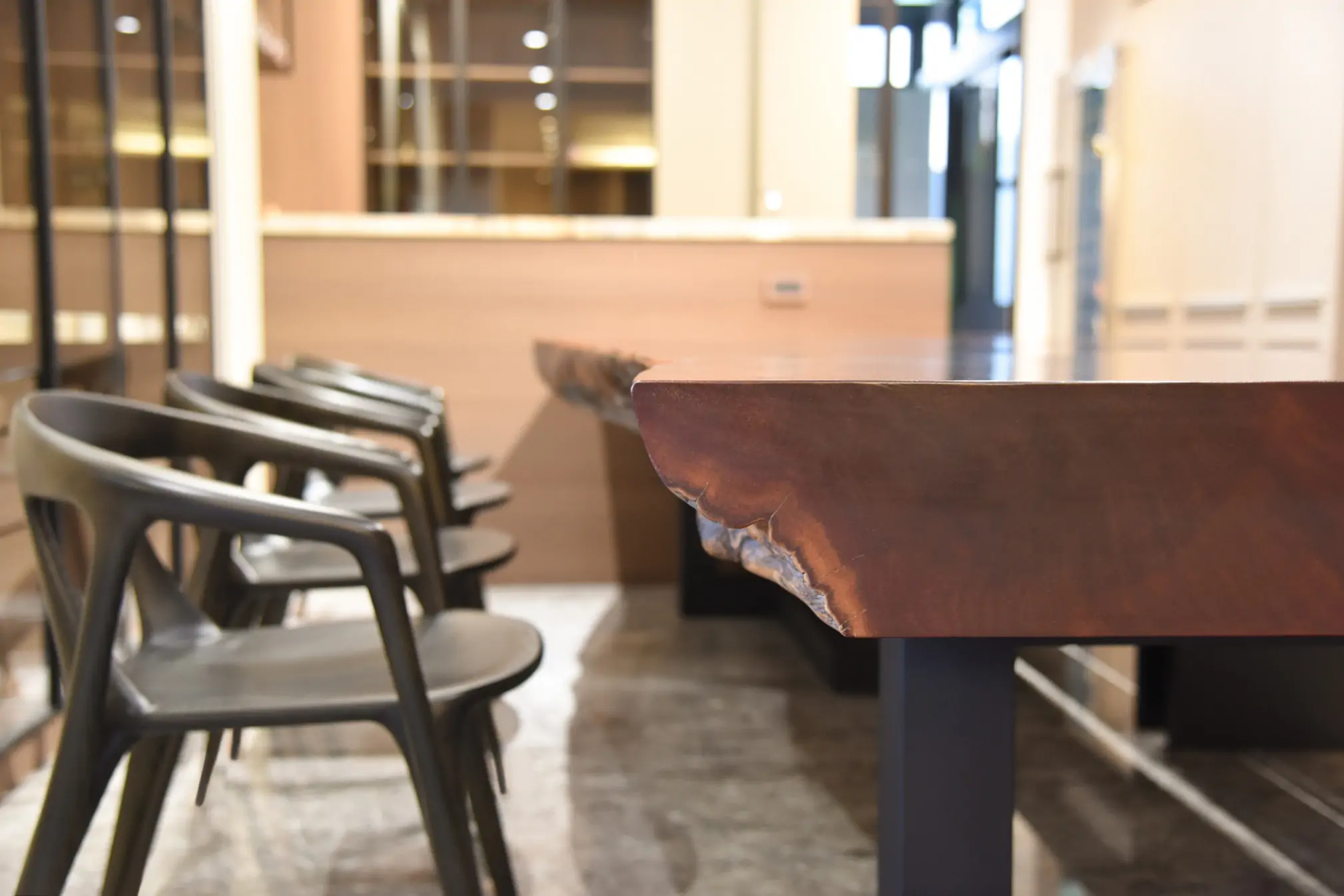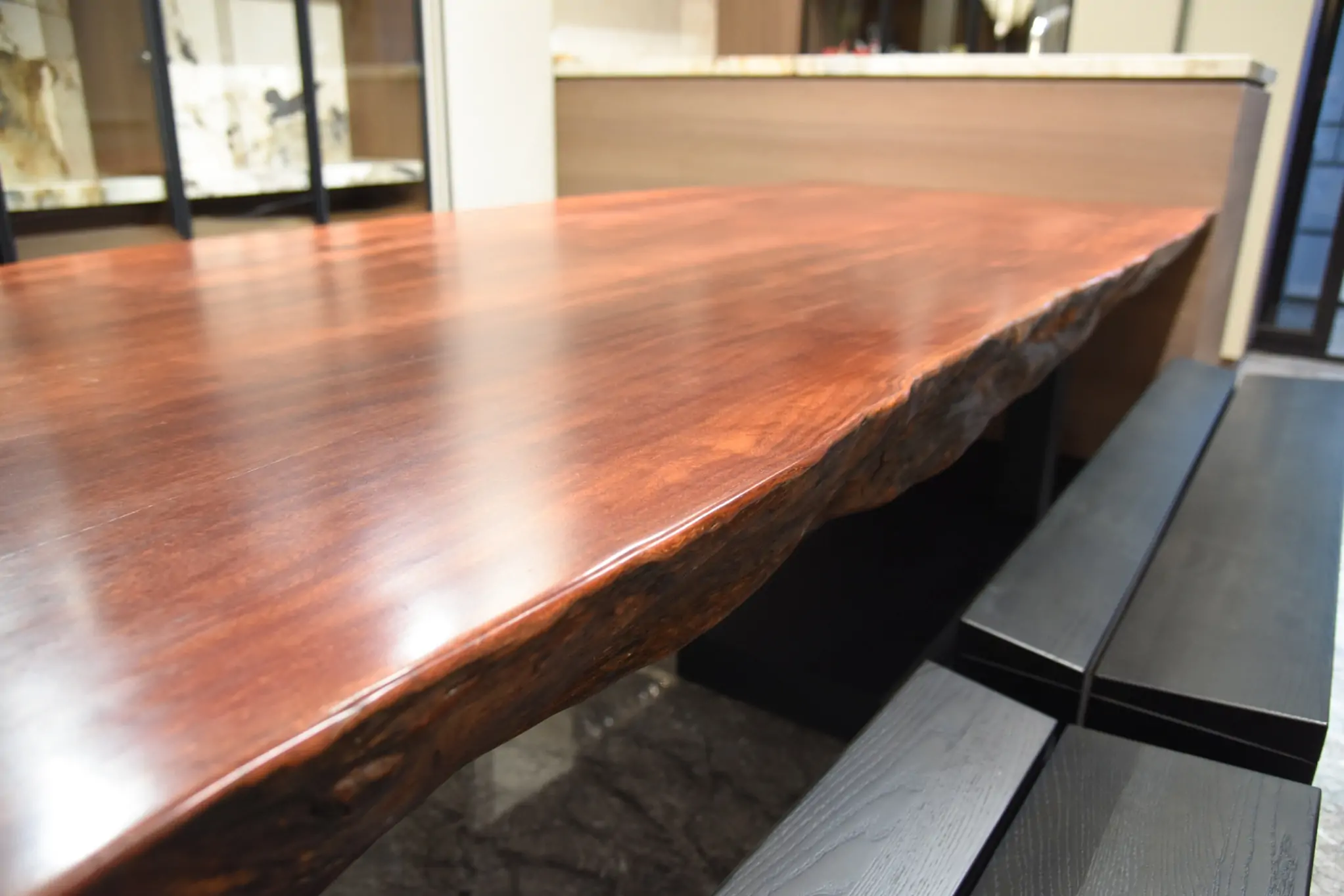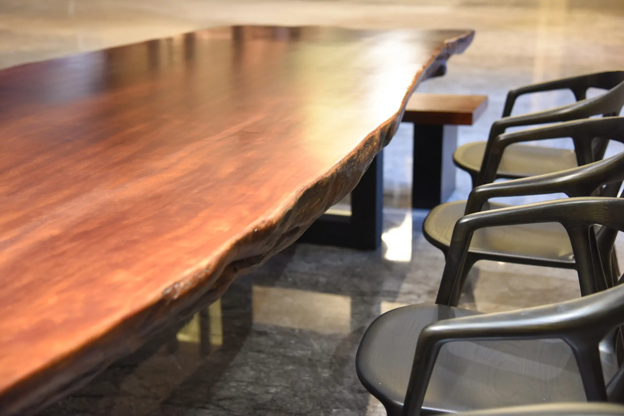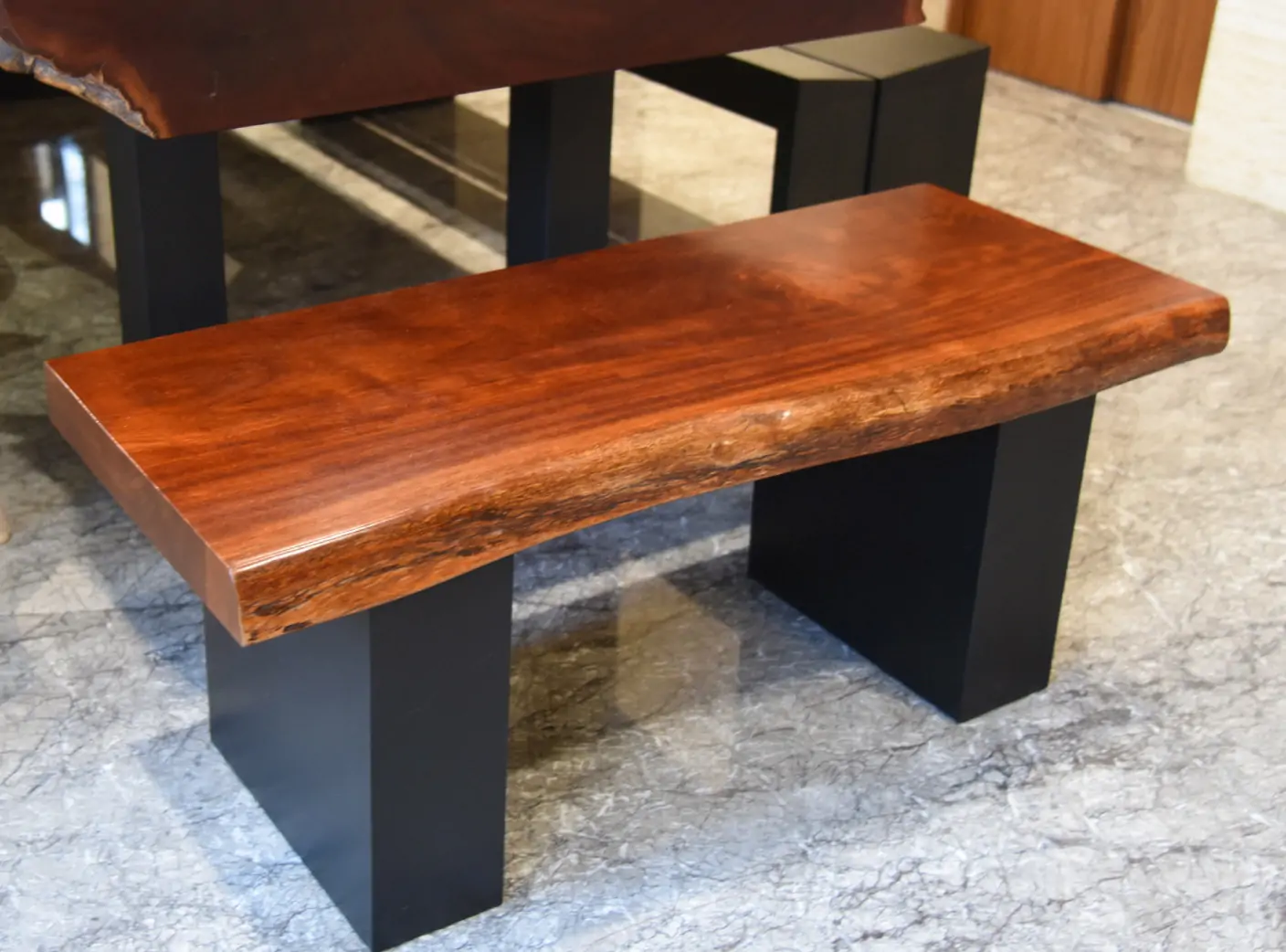 【🪵.#原木桌】 尺寸|360cm x 105cm x 15cm 面高|76cm 木種|非洲黑檀 硬度|高 桌腳|雙口字型鐵管腳 ——— 【🪵.#短板凳】 尺寸|105cm x 48cm x 6cm 面高|45cm 木種|非洲花梨 硬度|高 桌腳|實木腳 ——— 【🪵.#長板凳】 (客人自購) ——— 【🪵.#原木椅】 (客人自購)