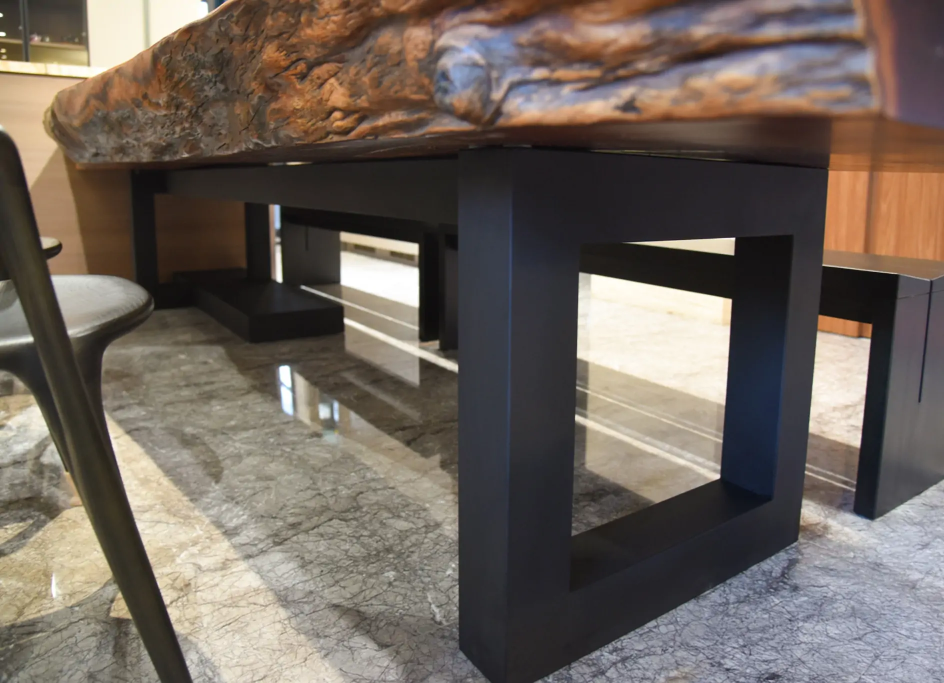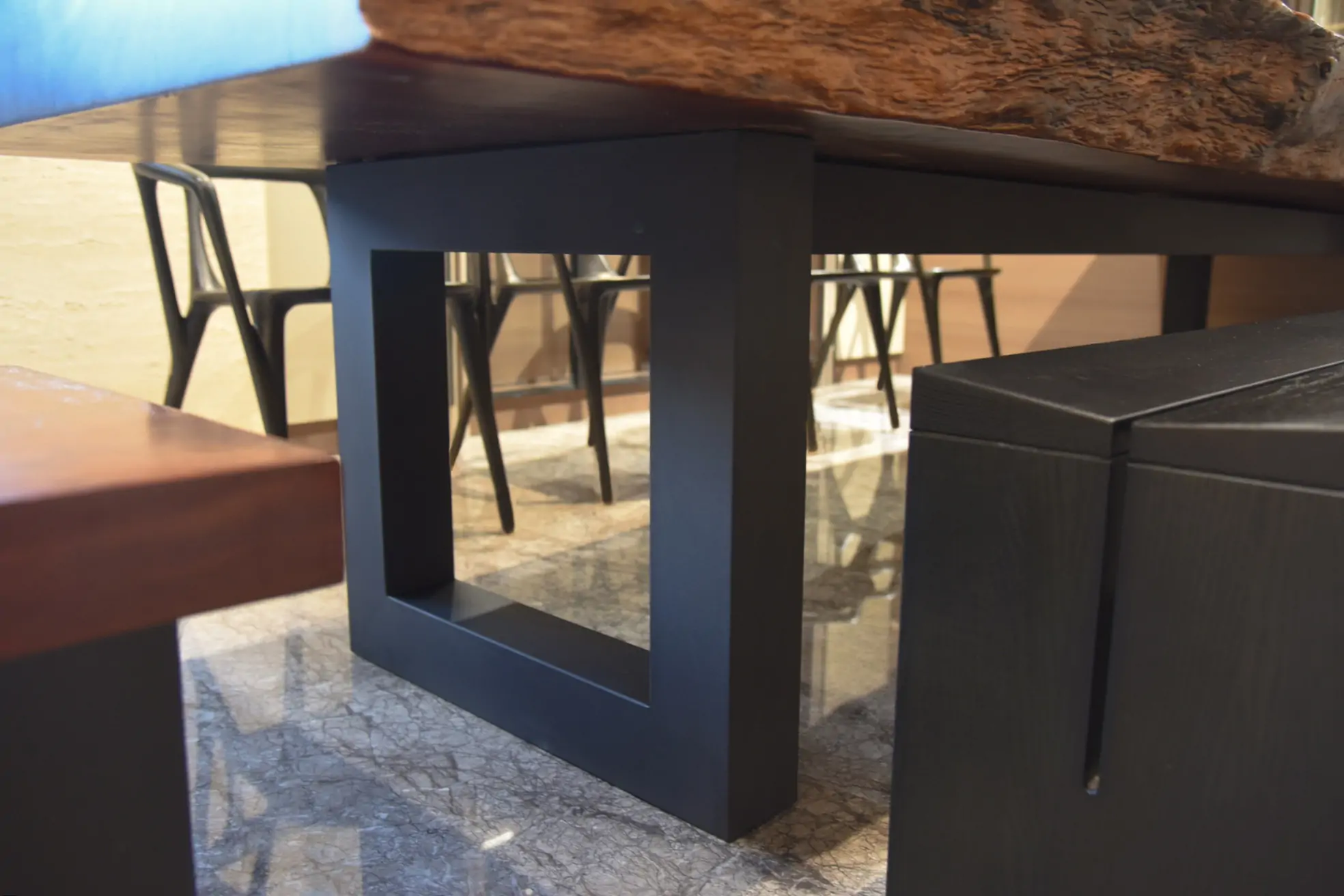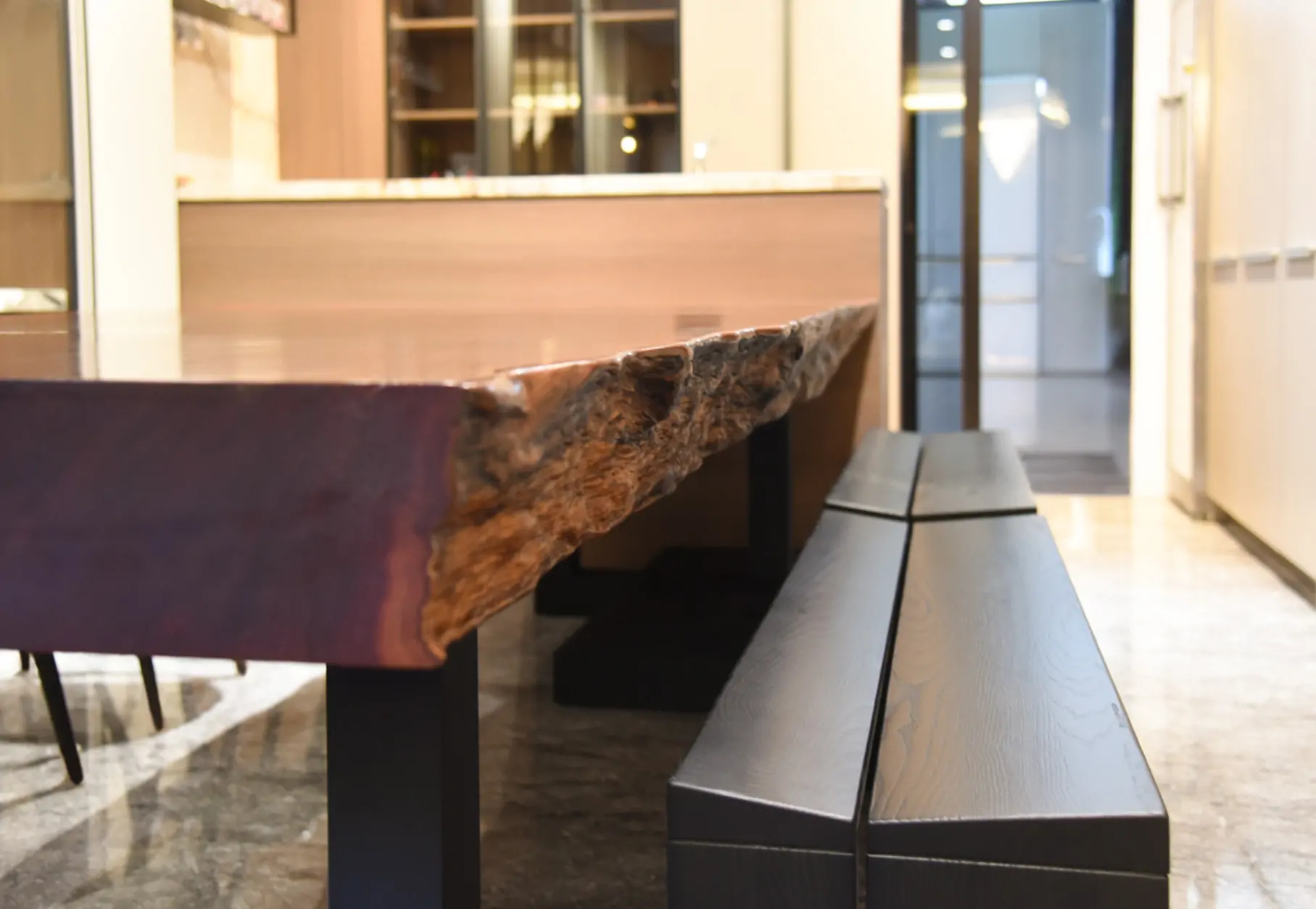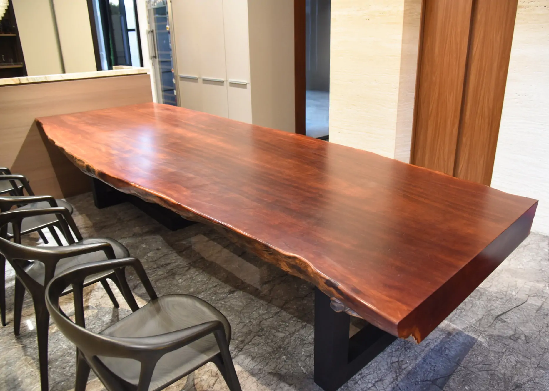 【🪵.#原木桌】 尺寸|360cm x 105cm x 15cm 面高|76cm 木種|非洲黑檀 硬度|高 桌腳|雙口字型鐵管腳 ——— 【🪵.#短板凳】 尺寸|105cm x 48cm x 6cm 面高|45cm 木種|非洲花梨 硬度|高 桌腳|實木腳 ——— 【🪵.#長板凳】 (客人自購) ——— 【🪵.#原木椅】 (客人自購)
