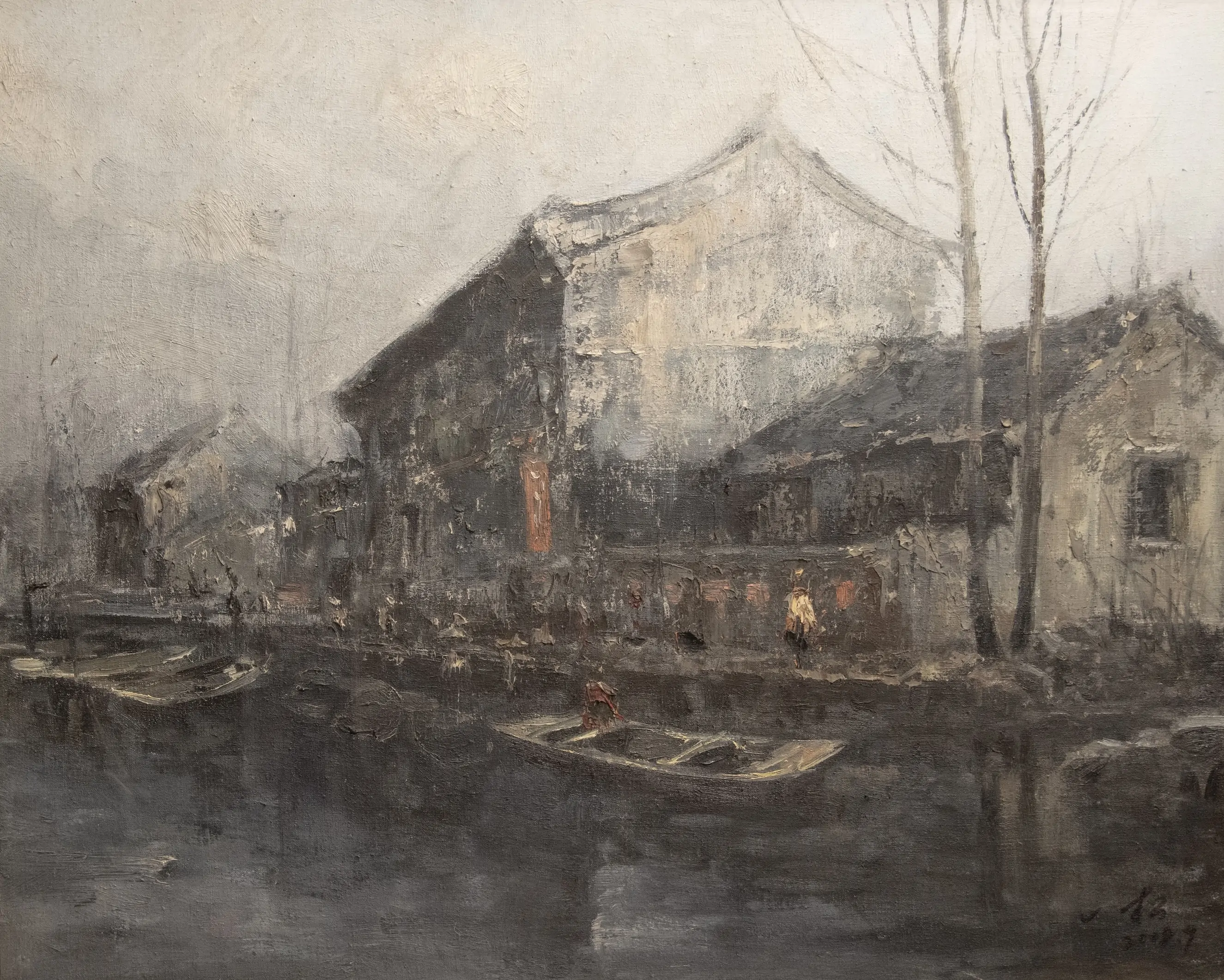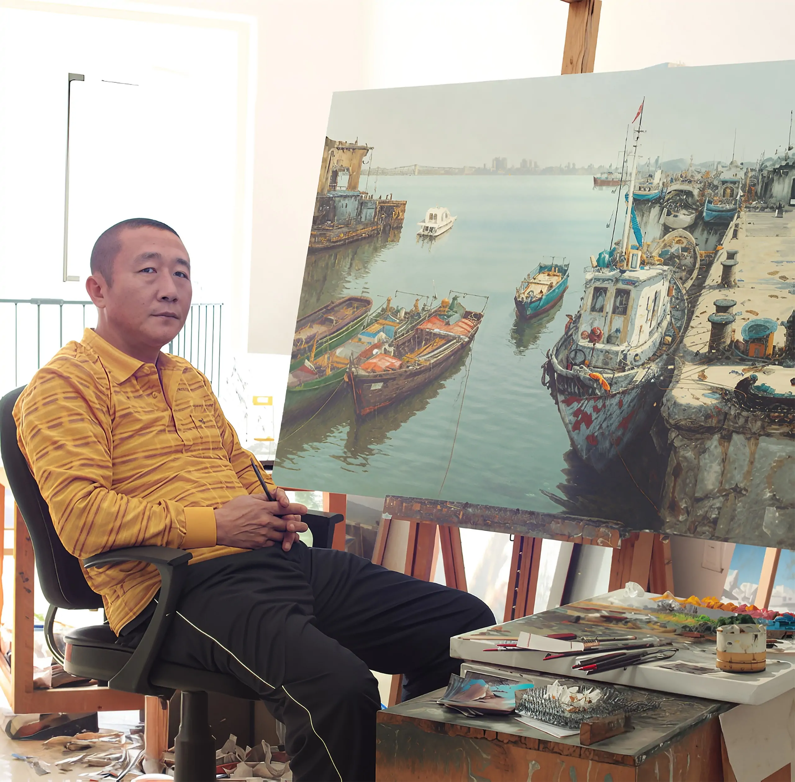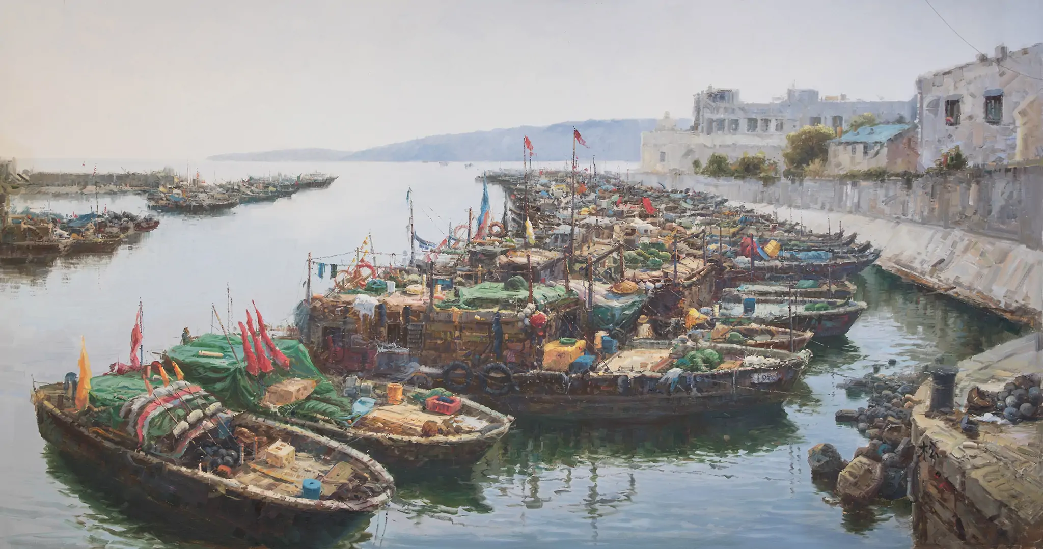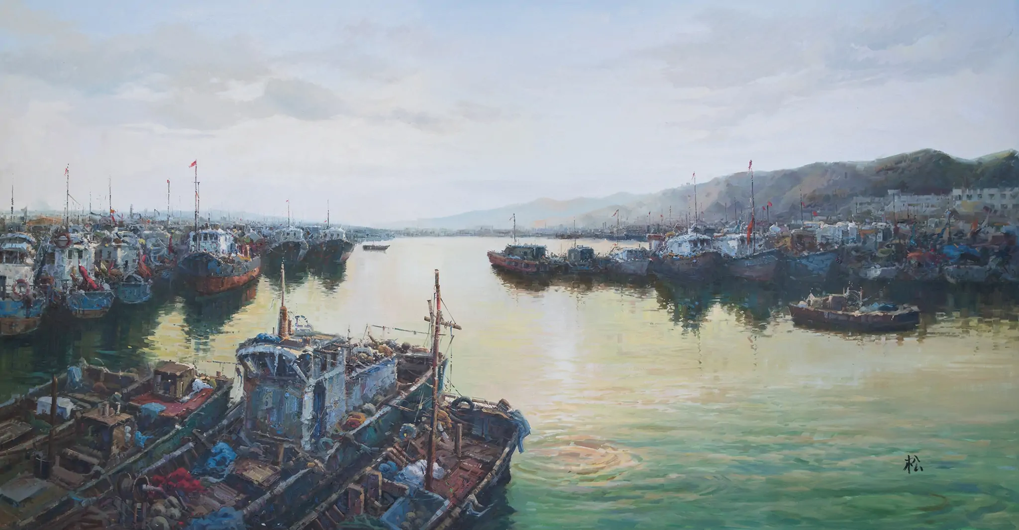 黃勁松,其藏於藏真的作品多以漁港風情與小鎮日常為題,