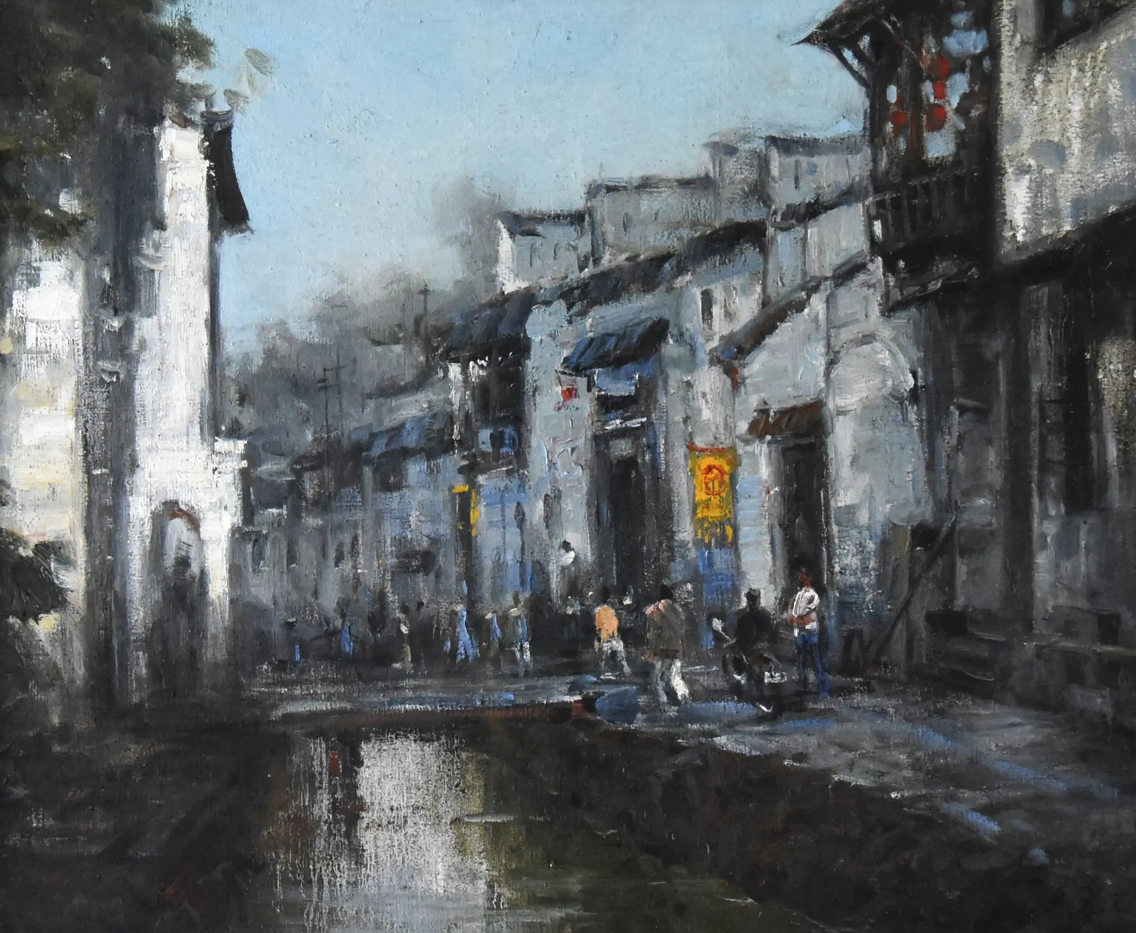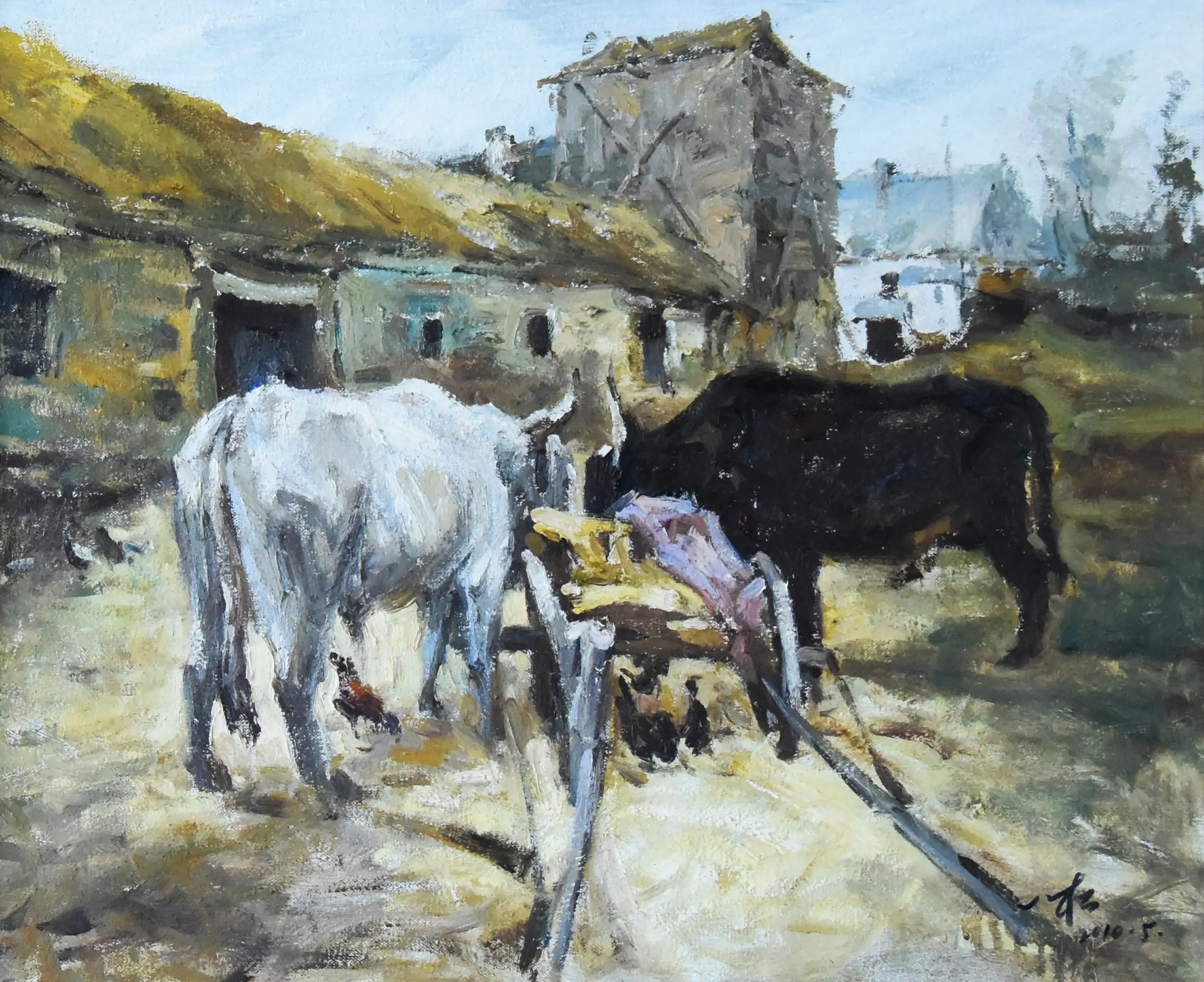 以油彩為主要創作媒材,擅長運用厚薄層次與細膩筆觸,